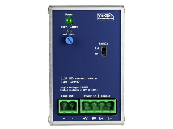 The “sett curr.” control knob allows users to adjust LED lamp intensity between 0–100% of the maximum set current. Once the maximum current has been configured via the “Curr. limit” trimmer, the intensity can be safely modified without risking lamp damage. An enable input permits PC/PLC control for switching the lamp off when unnecessary, reducing power consumption and heat dissipation.