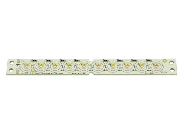 Powerful light strip with 10 LEDs. Can be configured with 10mm diameter optics for viewing angles ranging from 20 to 70 degrees FWHM.